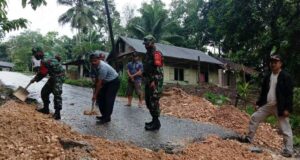 Babinsa Koramil 10/Lolowau Melaksanakan Kegiatan Gotongroyong Perbaikan Jalan yang Rusak di Desa...