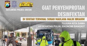 Cegah Penyebaran Covid-19, Sat Lantas Polres Gresik Semprot Disinfektan Di Terminal...