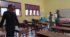 Brimob Bersama TNI dan Polsek Simpang Keuramat, Semprot Disinfektan di Sekolah