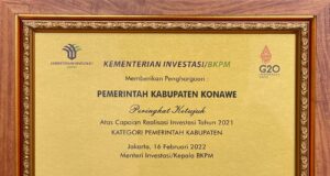 Pemkab Konawe Raih Penghargaan Atas Capaian Realisasi Invastasi di Tahun 2021