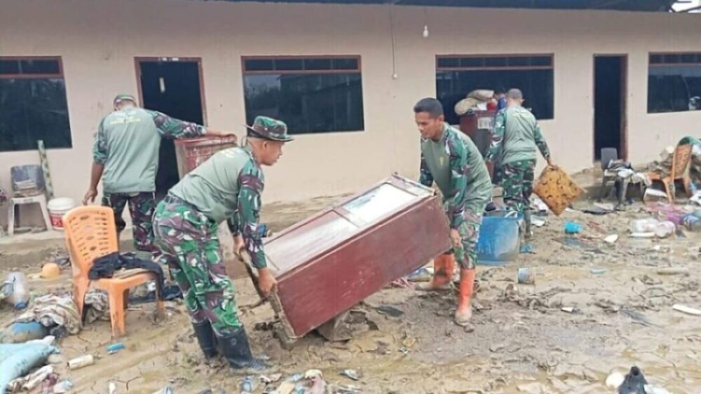 Di lokasi kegiatan, para prajurit tampak berjibaku mengeruk endapan lumpur pekat yang menutupi halaman, koridor, dan ruang kelas. Selain itu, sejumlah sarana belajar seperti bangku, meja, dan lemari kelas dievakuasi dari genangan lumpur agar dapat diselamatkan dan digunakan kembali.