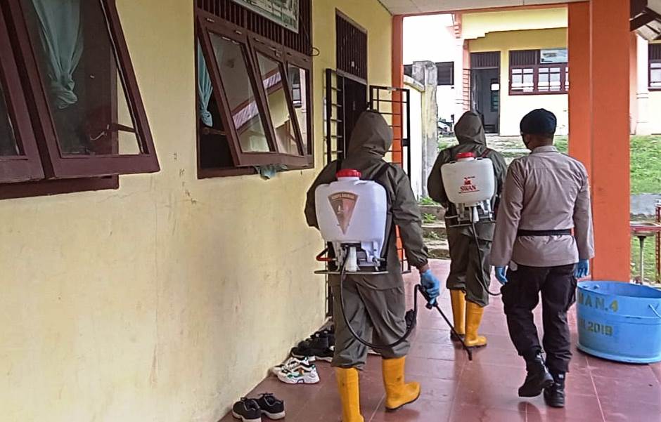 Covid 19 Belum Usai, Brimob Polda Aceh Sosialisasi Protokol Kesehatan Serta Semprot Disinfektan di Sekolah