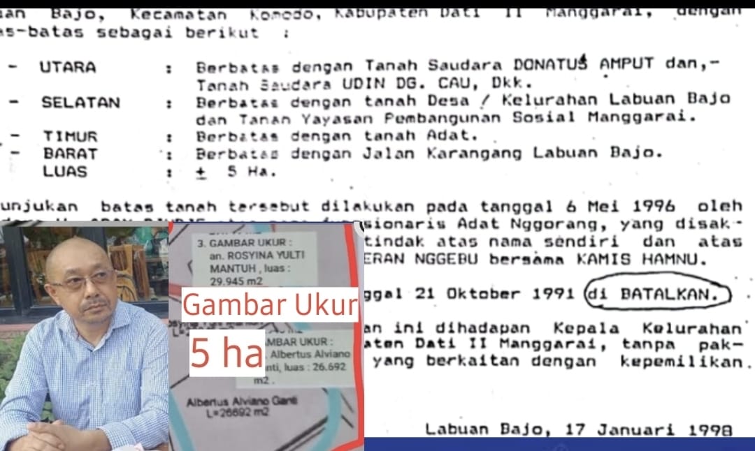 Dua dari 8 pemilik lahan 4,1 ha itu gugat perdata ke PN Labuan Bajo, perkars no.32, 33/2025. Alasan pokok gugatan ini adalah kepada GU total 5 ha atas nama Tergugat utama Rosyina Yulti Mantuh dan Albertus Alviano Ganti.