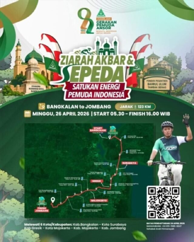JAKARTA, SUARA INDONESIA NEWS | Dalam rangka memperingati Hari Lahir (Harlah) ke-92, Gerakan Pemuda (GP) Ansor akan menggelar kegiatan bertajuk “Ziarah Kubro Muassis Nahdlatul Ulama & Gowes Sepeda”. Dimana menghubungkan Bangkalan hingga Jombang, Jawa Timur, pada Minggu 26 April 2026.