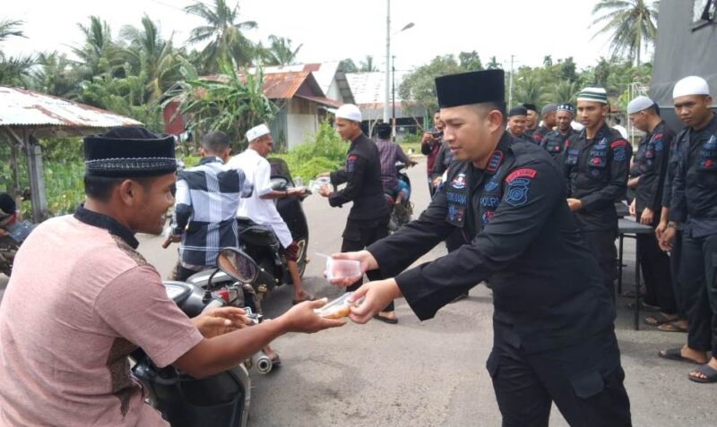 Suara Indonesia News – Aceh. Personel Kompi 1 Batalyon B Pelopor Satbrimob Polda Aceh  bagikan kue kotak dan air mineral kepada para jamaah shalat Jum’at di Masjid Darul Atiq yang berada di Desa Jeulikat, Kecamatan Blang Mangat, Kota Lhokseumawe Jum’at (27/01/2023).