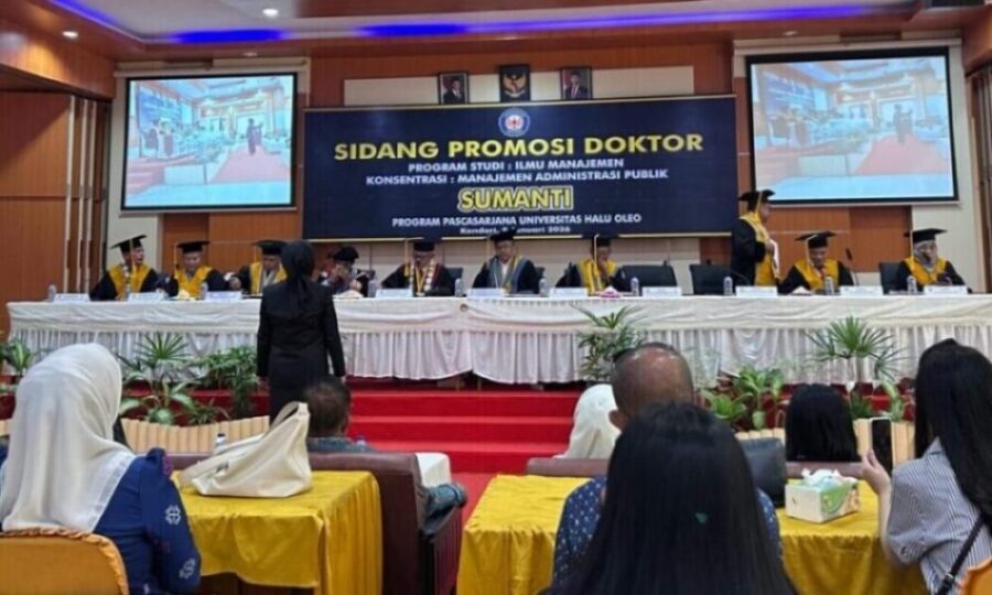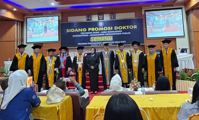 KENDARI, SUARA INDONESIA NEWS – Program Pascasarjana Universitas Halu Oleo (UHO) kembali memperkuat barisan akademisinya dengan melahirkan doktor baru. Adalah Dr. Sumanti, S.Sos., M.AP, yang resmi dikukuhkan sebagai Doktor ke-448 Universitas Halu Oleo setelah berhasil mempertahankan disertasinya dalam Ujian Terbuka (Promosi Doktor) pada Program Studi S3 Ilmu Manajemen, Jumat (9/1/2026).