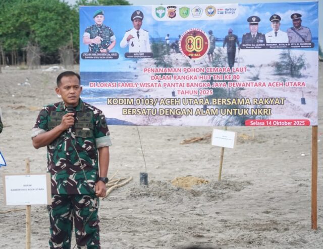 ACEH UTARA, SUARA INDONESIA NEWS | Dandim 0103/Aceh Utara Letkol Arh Jamal Dani Arifin, S.Sos., M.M.D.S., menghadiri kegiatan penanaman pohon cemara laut secara simbolis yang dilaksanakan dalam rangka memperingati HUT TNI ke-80 tahun 2025. Kegiatan tersebut berlangsung di kawasan Family Wisata Pantai Desa Bangka Jaya, Kecamatan Dewantara, Kabupaten Aceh Utara, Selasa (14/10/2025), dengan mengusung tema “Kodim 0103/Aceh Utara Bersama Rakyat Bersatu dengan Alam untuk NKRI.”