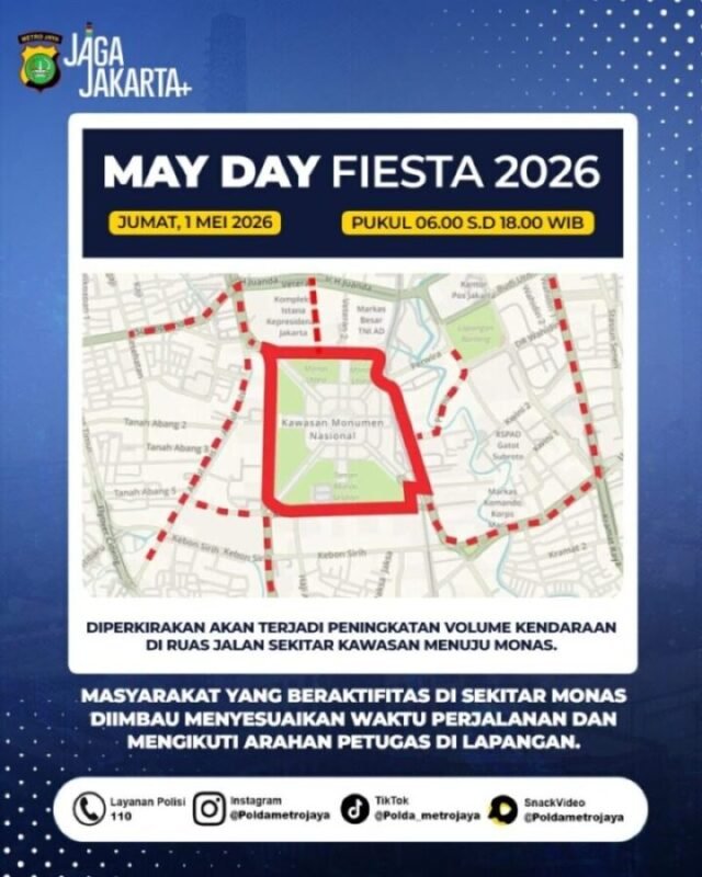 JAKARTA, SUARA INDONESIA NEWS | Dalam rangka peringatan Hari Buruh Internasional melalui kegiatan May Day Fiesta 2026 yang akan digelar di kawasan Monas pada Jumat, 1 Mei 2026, diperkirakan terjadi peningkatan volume kendaraan di sejumlah ruas jalan menuju lokasi acara. (30/04-26)
