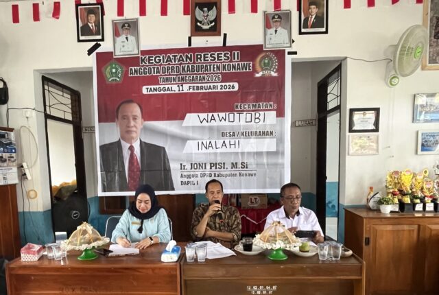 KONAWE, SUARA INDONESIA NEWS | Anggota DPRD Kabupaten Konawe dari Fraksi PDI Perjuangan, Ir. Joni Pisi, M.Si., menggelar reses masa persidangan II tahun 2026 di Balai Kelurahan Inalahi, Kecamatan Wawotobi, Kabupaten Konawe, Sulawesi Tenggara, Rabu (11/02/2026).