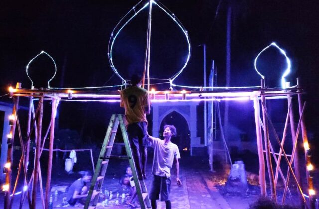 Tampak puluhan pemuda dengan antusias mempersiapkan gerbang hias lampu pelita, Kamis (28/04-2022)