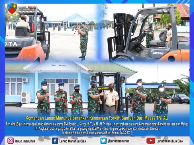 Suara Indonesia News - BIAK. Komandan Lanud Manuhua Marsma TNI Ronald L. Siregar S.T., M.M., M.Tr (Han)., menyerahkan satu unit kendaraan dinas Forklift bantuan dari Mabes TNI Angkatan Udara, yang diserahkan langsung kepada PNS Frans anggota Sie Angkutan Lanud...