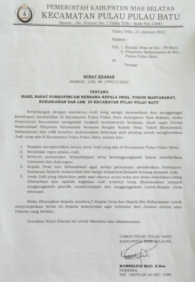 Suara Indonesia News - Nias Selatan. Keputusan Rapat Forum Komunikasi Pimpinan Kecamatan ( Forkopimcam), bersama Tokoh Agama, Tokoh Masyarakat, Tokoh Adat, Pemuda dan LSM Sekecamatan Pulau-pulau Batu Kabupaten Nias Selatan (Nisel) sepakat berhentikan judi didaerahnya.Hal ini tertuang dalam surat...