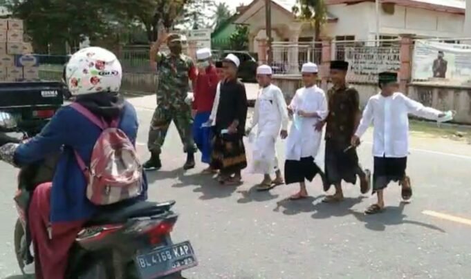 Suara Indonesia News - Aceh Utara. Babinsa koramil 05/Stb Kodim 0103/Aut Serda Budi Sutrisno melaksanakan kegiatan pembagian masker dan membantu menyeberangi anak anak yang akan melaksanakan pengajian di Mesjid Mideun Syuhada Kec. Syamtalira Bayu, Senin (07/2/2022).Untuk memberikan rasa aman...