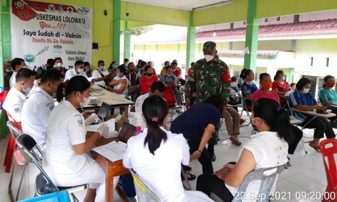 Suara Indonesia News - Nias Selatan. Babinsa Koramil 10/Lolowau Kodim 0213/Nias Sertu Hs. Simatupang dan Pratu K. Laoli menghadiri pelaksanaan serbuan Vaksinasi Massal Covid-19 tahap ke I ( satu) target 150 Dosis bertempat di UPTD Puskesmas Lolowau Kabupaten Nias...