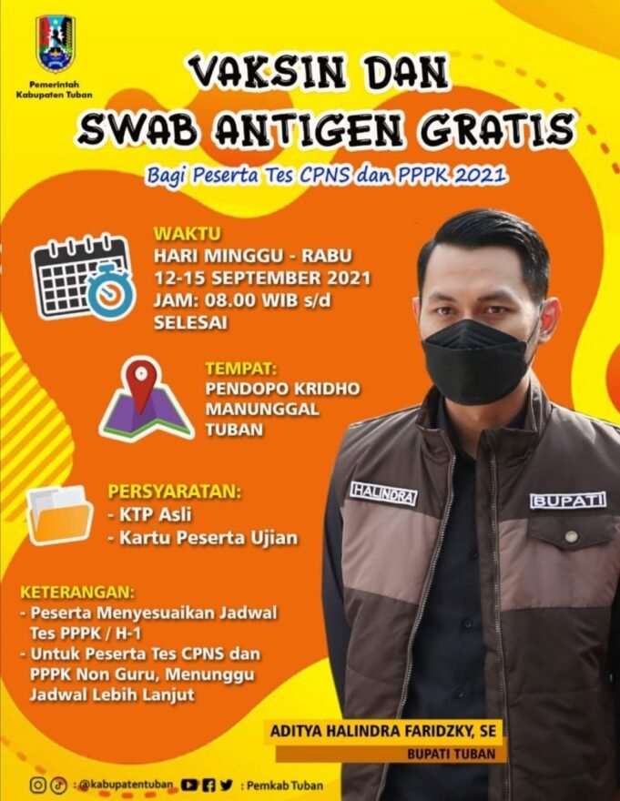 Suara Indonesia News - Tuban. Pemkab Tuban menggelar fasilitasi tes antigen dan vaksinasi Covid-19 bagi peserta Seleksi Kompetensi Pegawai Pemerintah dengan Perjanjian Kerja (PPPK) Guru di Lingkungan Pemerintah Kabupaten Tuban Tahun Anggaran 2021.Kepala Badan Kepegawaian dan Pengembangan Sumber Daya...