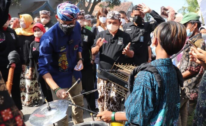 Pariwisata dan Ekonomi Kreatif (Menparekraf) Sandiaga Uno saat berkunjung ke Desa Gegesik Kulon Kabupaten Cirebon, Kamis...