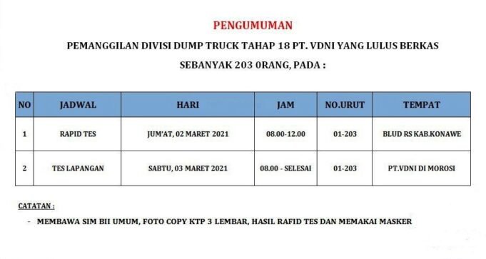 Suara Indonesia News - Konawe. Pengumuman peserta yang lolos berkas penerimaan Dump Truck Tahap 18 pada PT VDNICek Nama - nama Lolos Berkas di bawah ini :Tahap 18 Dump Truck