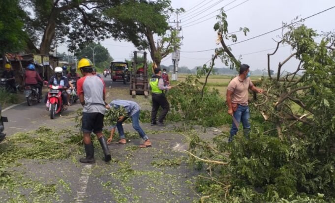 Suara Indonesia News - Gresik. Personel Polsek bersama warga membersihkan pohon yang tumbang akibat angin kencang yang terjadi di jalan raya Metatu-Cerme. Kamis, 25/3/2021.Pohon besar yang tumbang tersebut sempat menutup hampir sebagian badan yang menghubungkan kecamatan Benjeng dengan Kecamatan...