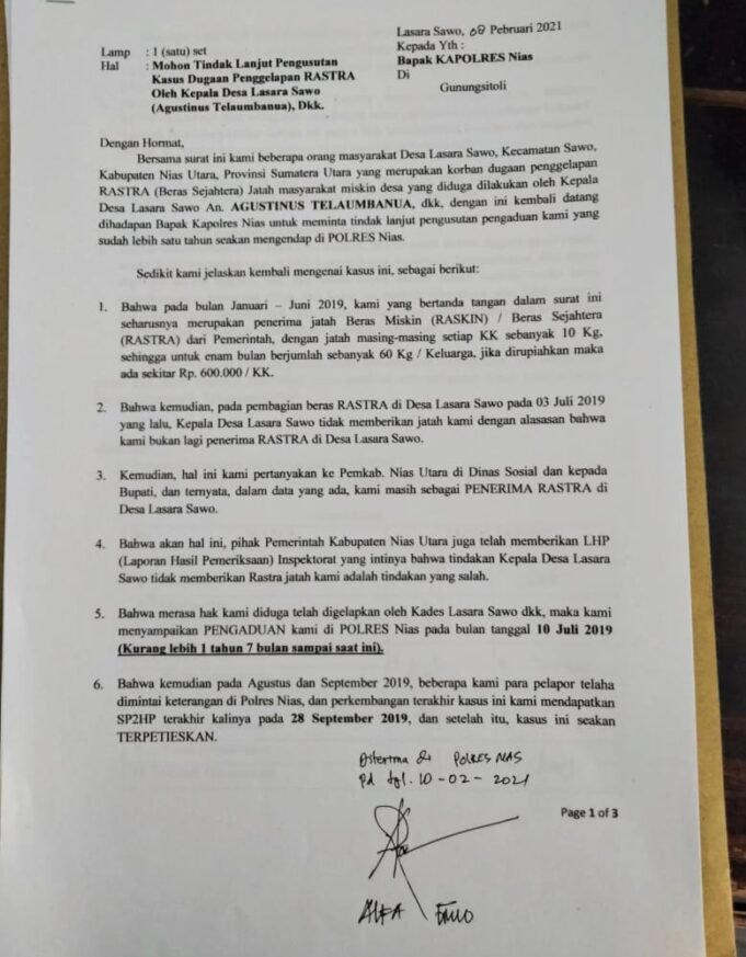 Suara Indonesia News - Gunungsitoli. Masyarakat Para Pelapor dugaan Penggelapan Rastra( Beras Sejahtera) Jatah Orang Miskin di Desa Lasara Sawo kembali ingatkan Polres Nias agar mengusut tuntas Laporannya pada dugaan Penggelapan Rastra yang diduga Pelaku oleh Kepala Desa Lasara...