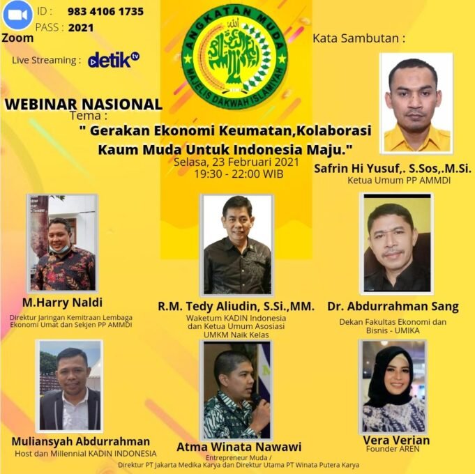 Suara Indonesia News - Jakarta. Pimpinan Pusat Angkatan Muda Majelis Dawah Islamiyah (PP AMMDI) usai melaksanakan webinar nasional bersama sejumlah pengusaha muda, Pelaku Usaha dan akademisi serta pengurus KADIN Indonesia, tadi hari Selasa (24/2/2021) pada pukul 19.00 hingga 22.00...