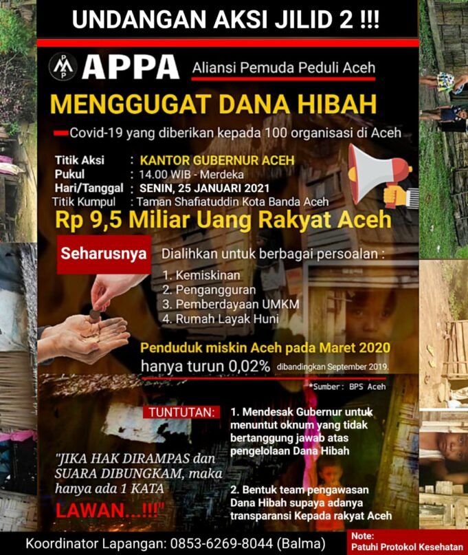 Suara Indonesia News - Banda Aceh. Aliansi Pemuda Peduli Aceh (APPA) Jilid 2 akan melakukan aksi demonstrasi kembali di kantor Gubernur Aceh pada Senin, (25/01/2021) pukul 14.00 WIB untuk menuntut kembali berbagai persoalan terkait dana hibah Covid-19 yang diberikan...