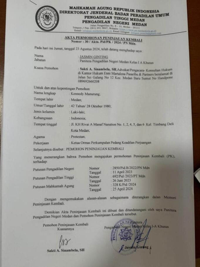 Suara Indonesia News - Medan. Kennedy Manurung telah resmi mengajukan Akta Peninjauan Kembali (PK) terkait kasus yang dihadapinya. Informasi ini disampaikan langsung oleh Kennedy Manurung kepada sejumlah wartawan, Sabtu (31/08-24), saat ditemui di Rutan Tanjung Gusta Medan.Kennedy Manurung menyatakan...
