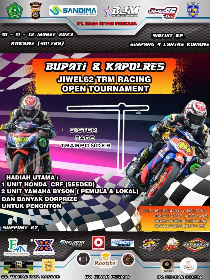 Suara Indonesia News – Konawe. Bupati Konawe, Kery Saiful Konggoasa (KSK) bersama Kapolres Konawe, AKBP Ahmad Setiadi, menggelar road race open tournament bersama Jiwel 62 Tumpas Raya Motor (TRM) dalam rangka Hari Ulang Tahun (HUT) ke-63 Kabupaten Konawe.Sekretaris panitia...