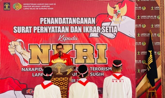 Suara Indonesia News - Gunung Sugih Lampung. Tiga warga binaan pemasyarakatan Lembaga Pemasyarakatan Kelas IIB Gunung Sugih melaksanakan Penandatanganan Pernyataan dan Ikrar Setia kepada NKRI Kamis 17 November 2022 pukul 13.00 WIB di Aula Dr. Sahardjo S.H.Masing-masing narapidana Terorisme...