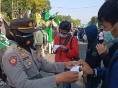 Personel Polres Cirebon Kota, Bagikan Ratusan Masker pada Peserta Aksi Mahasiswa di Depan Gedung...