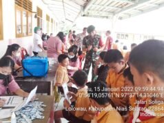 Suara Indonesia News - Nias Selatan. Babinsa Koramil 10/ Lolowau Kodim 0213 Serda Fery Samosir Dan Praka Tondi Damanik mendampingin pelaksanaan Vaksin Covid-19 kepada Anak usia 6-11 Tahun bertempat di SD Togizita Kecamatan Hilimegai...