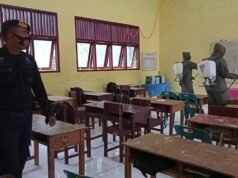 Brimob Bersama TNI dan Polsek Simpang Keuramat, Semprot Disinfektan di Sekolah