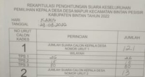 Suara Indonesia News - Bintan Kepri. Hasil pemantauan hitungan suara pemilihan Kepala Desa Mapur Kecamatan Bintan Pesisir Kabupaten Bintan Provinsi Kepulauan Riau, 29 september...